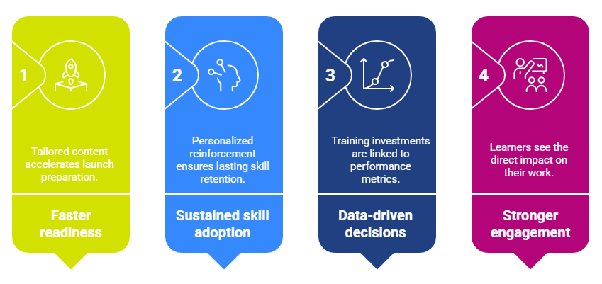 - Sustained skill adoption through personalized reinforcement rather than “event-based” learning.